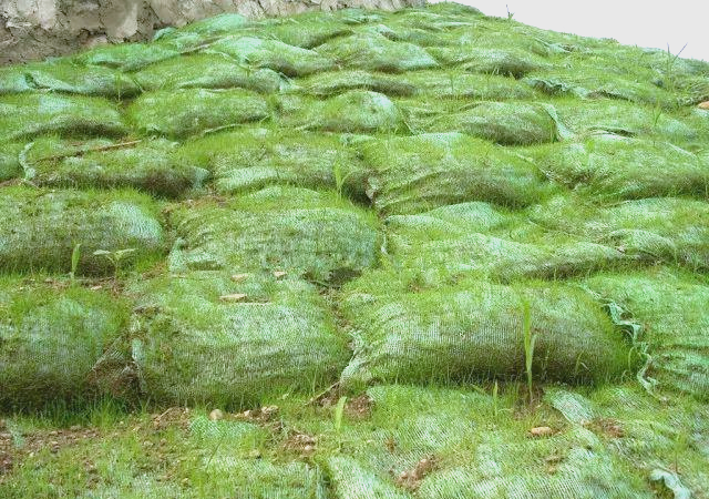 植生袋的制作過程包括將含有種子和肥料的無紡布與專用PVC網(wǎng)袋相結(jié)合,隨后在袋內(nèi)填充種植土。通過合理利用山體形狀,這些植生袋被巧妙地堆疊起來,共同構(gòu)建出綠化的坡面。